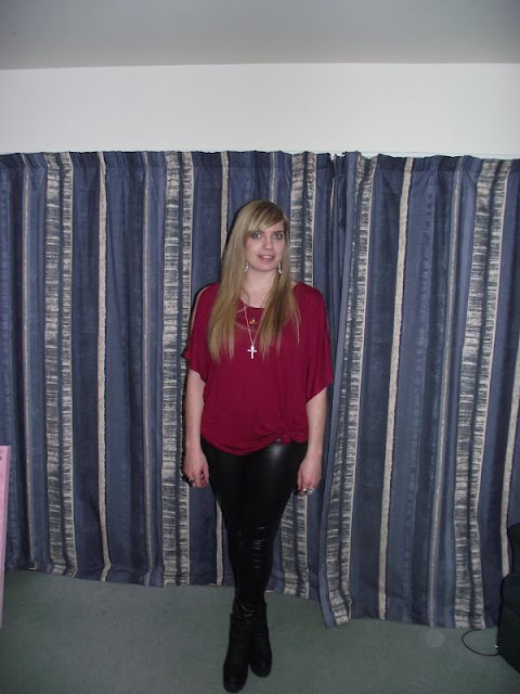 As the title suggests and as you may guess by my outfit pictures I have found me some leather look pants.....I have wanted some for ages and these are super comfy and fit well love them! In fact this outfit is all new, I love the plain top as its a different sort of colour than what I have and of course the cut out sleeves = win. With my obsession for wedges I couldnt turn these puppies down unfortunately arent they funky? and closed in to keep my tootsies warm through winter hehe.